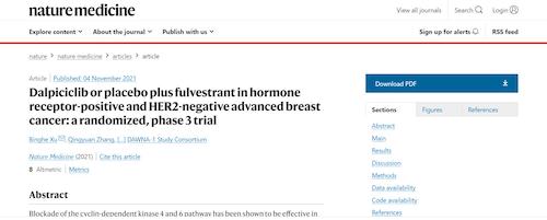 11月4日,国际四大医学期刊之一、英国《自然》旗下《自然医学》(Nature Medicine)在线发表CDK4/6抑制剂达尔西利(SHR6390)联合氟维司群治疗既往内分泌治疗后疾病进展的HR+/HER2-晚期乳腺癌的多中心、随机、双盲III期临床研究(DAWNA-1研究)中期分析结果报告,首次对氟维司群(雌激素受体降解剂)±达尔西利治疗激素受体阳性晚期乳腺癌的有效性和安全性进行了比较。研究结果显示,达尔西利+氟维司群组与安慰剂+氟维司群组相比,无进展生存期(PFS)显著延长。该项研究由中国医学科学院肿瘤医院徐兵河教授担任leading PI,全国39家医院参研,由AG电子医药临床研发团队支持完成。